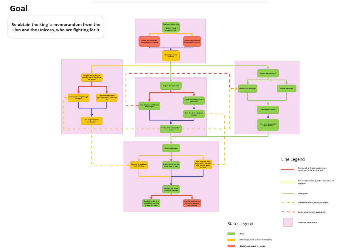 Using a chapter from Through the Looking Glass and What Alice Found There as inspiration, I created a branching narrative tree to establish the game’s core structure. To maintain consistency in tone and world rules, I also developed a worldbuilding document that guided the writing and design of the Fey Realm.