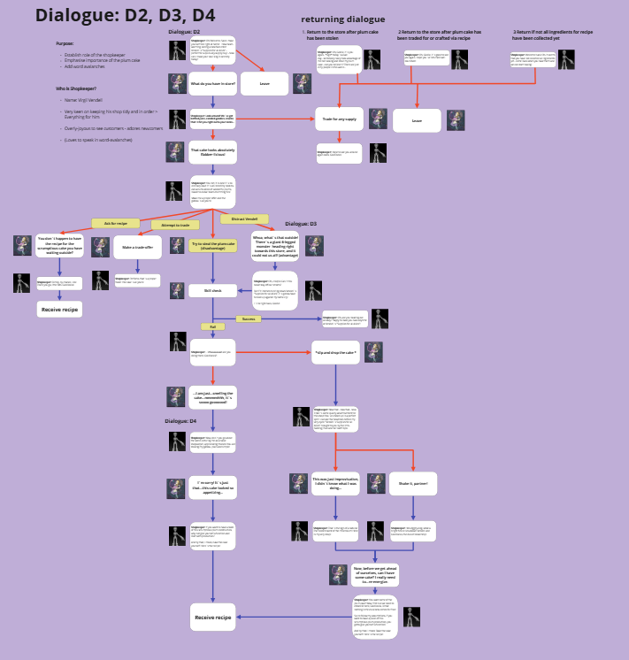 To keep track of branching dialogue and its pathways, I mapped and wrote the entire game’s dialogue in Miro. This approach enabled team members to review and provide feedback before implementation by attaching sticky notes directly to the dialogue.