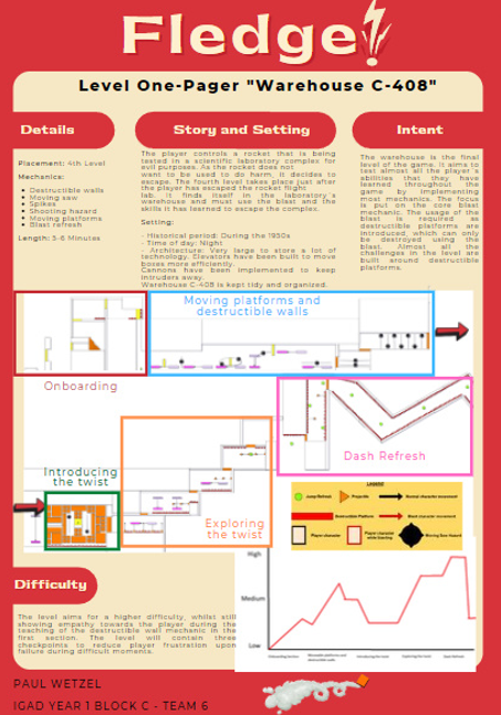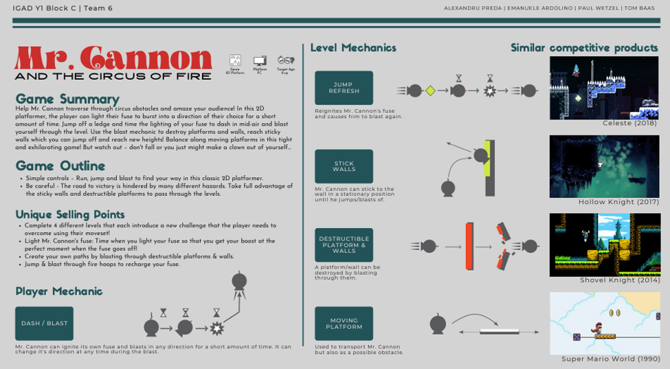 To communicate our design idea to the stakeholders, the team created a One Pager, outlining the game´s summary and USPs, our central player mechanic and four different level mechanics.