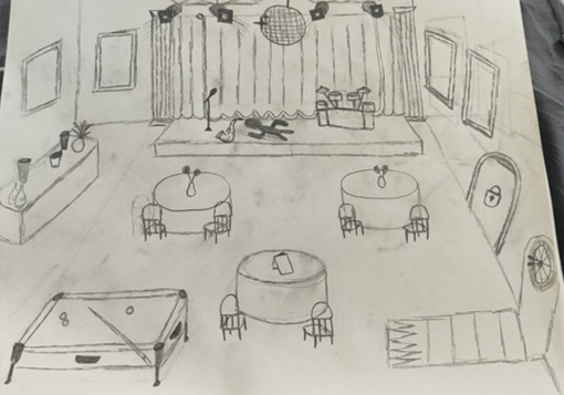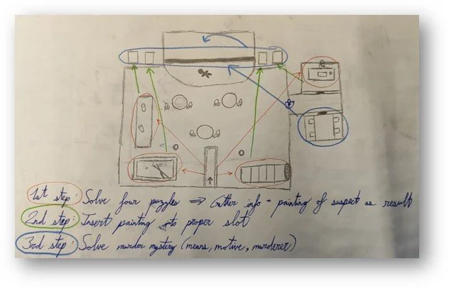 Early on, I decided on a Jazz Bar setting with a murder mystery theme. I used sketches to explore the room layout and puzzle structure, considering which puzzles would make sense both from a design and narrative perspective.