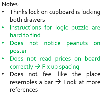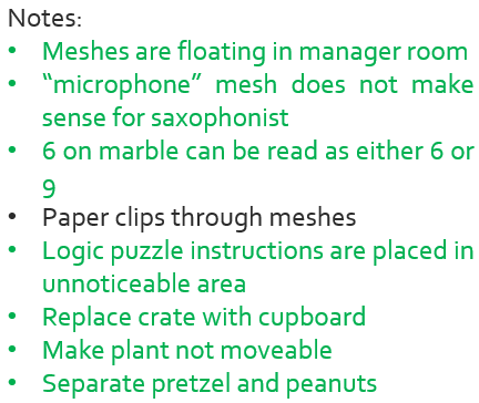 The room went through a lot of testing and iteration sessions. I created notes from playtester remarks and derived action points from them.