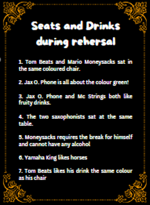 Instructions created for a logic puzzle, which requires the player to assign the suspects and their drinks to their corresponding seats.