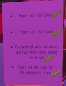 The room contains four core puzzles, the completion of each rewarding the player with a picture of one of the suspects as well as their claims of what happened during the night. All of the pictures must be hung correctly onto the wall before the final puzzle can be accessed.